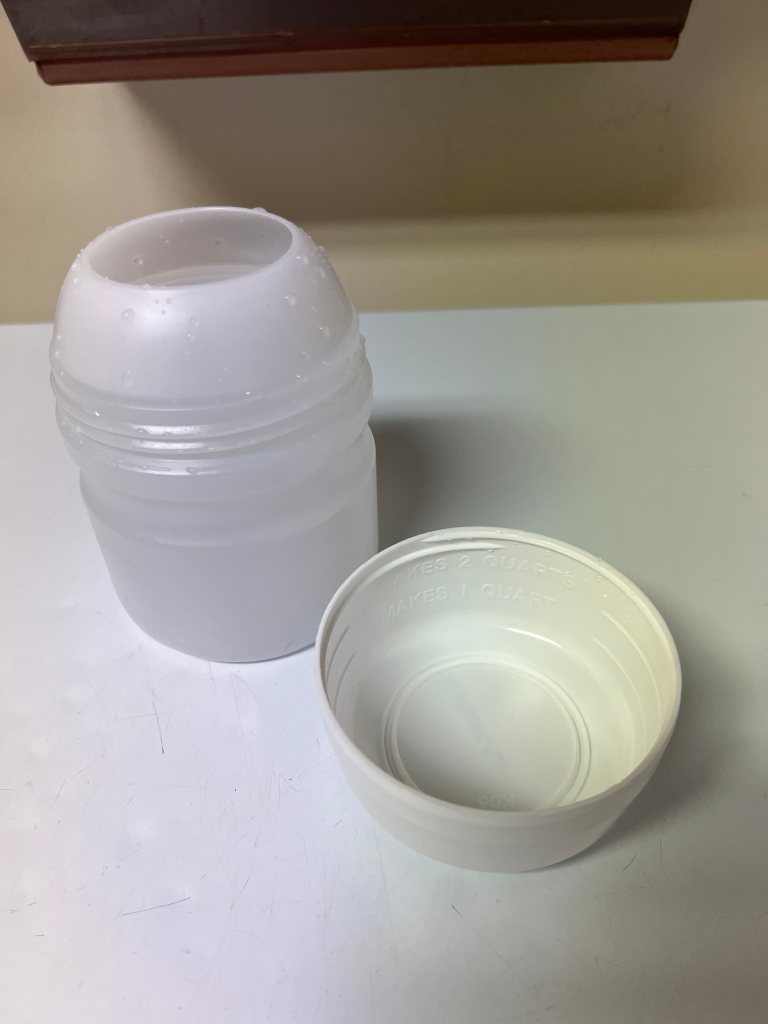 My favorite way to carry extra water for the dogs is in an old Country Time lemonade mix container. I use the mix to make my own Gatorade substitute (just stir a scoop into a half-gallon of ice water and add a pinch of Himalayan salt to replenish electrolytes*), and when I run out of the powdered mix, the empty containers make handy water storage, as the lids — which are big enough to double as dog bowls — screw on tightly to prevent spills. Each container holds about three cups, and our pack will go through about one container per mile on a moderately warm day like today.